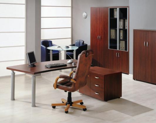 Шкафная группа представлена различными по высоте шкафами. Тонированные стекла в металлических рамах сложного сечения придают выразительность изделиям. При наличии большого количества позиций из стекла сохраняется массивность, респектабельность кабинета.