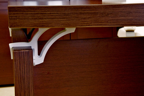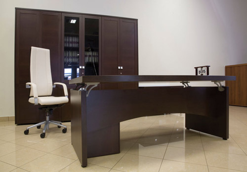 Столешницы толщиной 50 мм, массивные опоры из ДСП и алюминия соответствуют представлениям надежности и респектабельности.