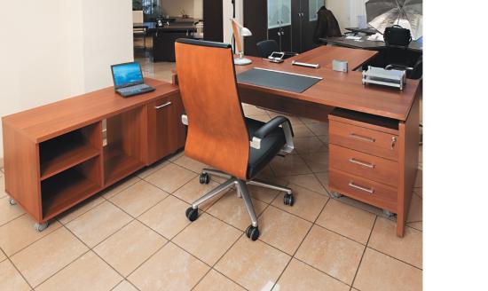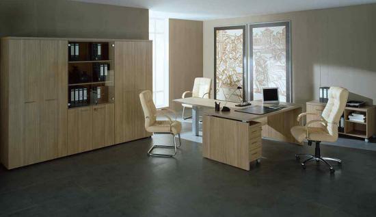 Модельный ряд кабинета разнообразен: столы рабочие (160х80х75 см и 180х90х75 см), боковая брифинг-приставка с опорной тумбой, стол приставной, брифинг-приставка на опоре, тумба выкатная, тумба под оргтехнику, две разновидности столов для переговоров. Шкафы для документов и верхний ящик выкатной тумбы снабжены замками.