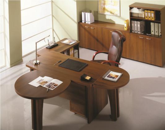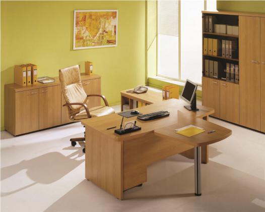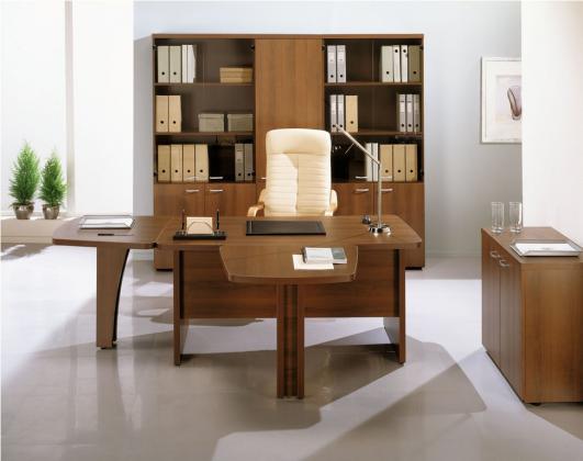 Шкафная группа представлена двустворчатыми шкафами и колонками. Вместительные шкафы, тумбы и греденции позволят правильно и удобно организовать размещение всех бумаг и документов. Все тумбы изготавливаются с центральным замком. Представительность любому кабинету придаст стол для переговоров, который имеет возможность менять конфигурацию за счет приставных элементов.