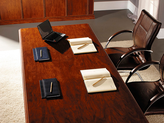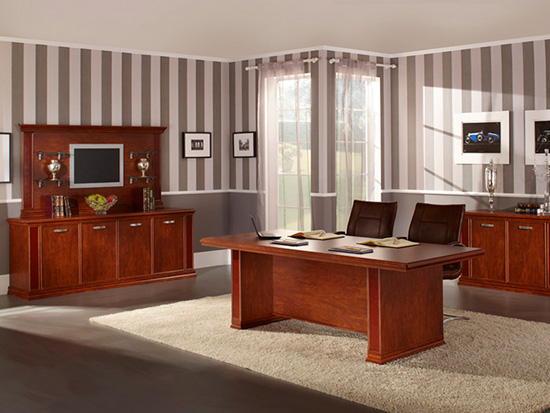 Стол руководителя декорирован элементами под крокодиловую кожу, обрамленными профилем из МДФ. Наборная система позволяет в случае необходимости дополнить его брифингом, подвесными тумбами или приставкой. Модули легко закрепить с любой стороны в зависимости от расположения рабочей зоны. Модельный ряд включает в себя стойку ресепшн, вместительные шкафы с полками для бумаг и гардероб. Все дверцы оборудованы доводчиками и дополнены элементами из стекла.