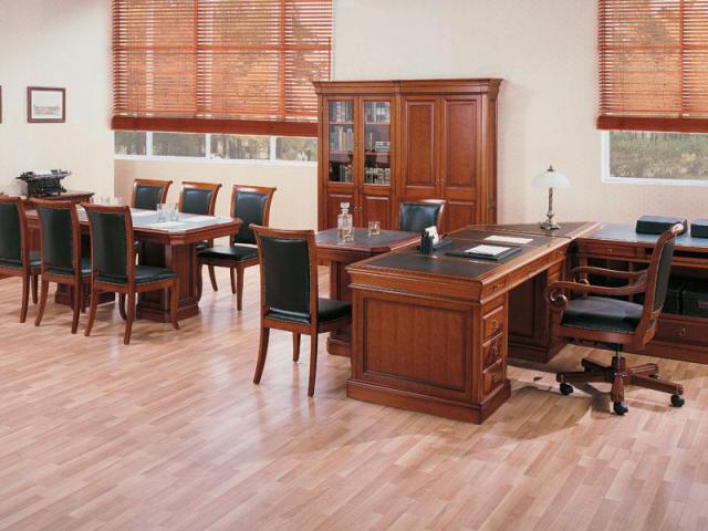 Кабинет руководителя «Ришар» – содержит в себе целый перечень изящных как по внешности, так и по используемым материалам составляющих рабочих компонентов. Стол для письма, фронтальная приставка для брифинга, столики журнального типа, и угловые столики, удобные кресла, как для посетителей, так и для руководителя. Столешницы выполнены из натуральной древесины и имеют кожаные вставки зелёного цвета, что в сочетании с отделкой кресел из кожи, позволяют сотворить непередаваемую атмосферу традиционного элегантного величия и сдержанной роскоши.