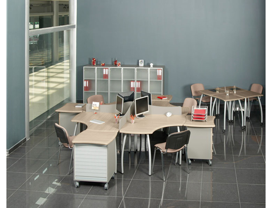 Преимущества коллекции в том что она изготовлена из МДФ (Medium Density Fideboard) — экологически чистого материала и сочетает компактные размеры с уникальной формой, что позволяет создать множество вариантов компоновки, экономит офисное пространство, позволяя вместить на 20-30% больше рабочих мест.