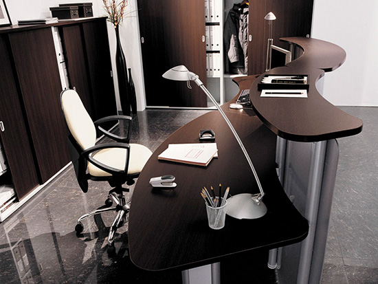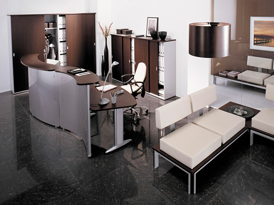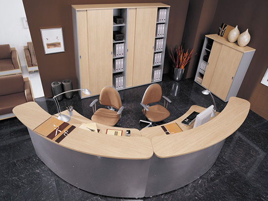 Оставшиеся три модели стоек — это полукруглые и угловые (60 °) столы ресепшн, выполненные в светлом и темном тонах. Все модели ресепшн «Некст» изготовлены из ЛДСП и покрыты итальянским ламинатом.