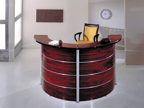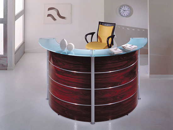 Ресепшен York состоит из: полукруглой стойки; прямых внутренних элементов; различных топов (прямые и под углом 60 о, стеклянные и из МДФ); креденции; подкатной тумбы; шкафа для бумаг.