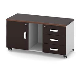 Используется ламинированная плита толщиной 28 мм и 22 мм стандарта эмиссии Е1. Торцы плиты облицованы прочной профилированной противоударной кромкой производства Германии. Цвет кромки соответствует цвету ДСП. Применяется фурнитура ведущих европейских производителей, в том числе центральные замки для тумб, роликовые направляющие выдвижных ящиков и регулируемые по высоте опоры столов и шкафов.