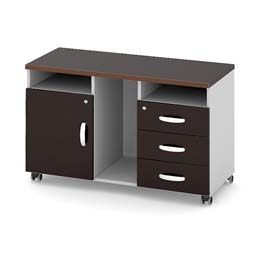 Используется ламинированная плита толщиной 28 мм и 22 мм стандарта эмиссии Е1. Торцы плиты облицованы прочной профилированной противоударной кромкой производства Германии. Цвет кромки соответствует цвету ДСП. Применяется фурнитура ведущих европейских производителей, в том числе центральные замки для тумб, роликовые направляющие выдвижных ящиков и регулируемые по высоте опоры столов и шкафов.