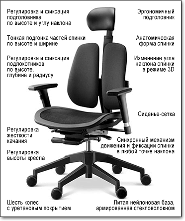 Кресла выполнены в черном цвете, что в сочетании с элементами настройки спинки, отделанными хромом, выглядит очень современно и статусно.