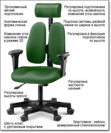 Основанием спинки служит металлический штифт, также он выполняет функции амортизатора, который работает на выпрямление корпуса в вертикальное положение. В зависимости от веса пользователя выравнивается упругость штифта, что позволяет сбалансировать нагрузку на позвоночник.