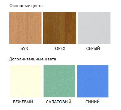 Мебель этой серии изготавливается из ламинированной ДСП 22 мм и 16 мм в цветовом исполнении "БУК", "ОРЕХ", "СЕРЫЙ", а также дополнительные цвета: "САЛАТОВЫЙ" в сочетании с цветом "БУК", "БЕЖЕВЫЙ" в сочетании с цветом "ОРЕХ", "СИНИЙ", в сочетании с цветом "СЕРЫЙ".
